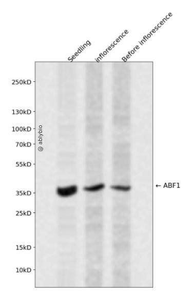 Western blot analysis of ABF1 expressed in Seedling,inflorescence,Before inflorescence using ABF1 Rabbit pAb at 1:1000. Secondary antibody: HRP Goat Anti-Rabbit IgG (H+L) at 1:5000. Lysates/proteins: 30ug per lane. Blocking buffer: 5% non-fat dry milk in TBST. Detection: ECL Enhanced Kit. Exposure time: 120s.