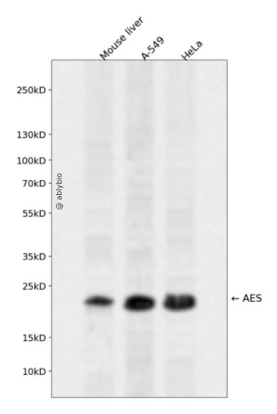 Western blot analysis of AES expressed in Mouse liver,A-549,HeLa using AES Rabbit pAb at 1:1000. Secondary antibody: HRP Goat Anti-Rabbit IgG (H+L) at 1:5000. Lysates/proteins: 30ug per lane. Blocking buffer: 5% non-fat dry milk in TBST. Detection: ECL Enhanced Kit. Exposure time: 120s.