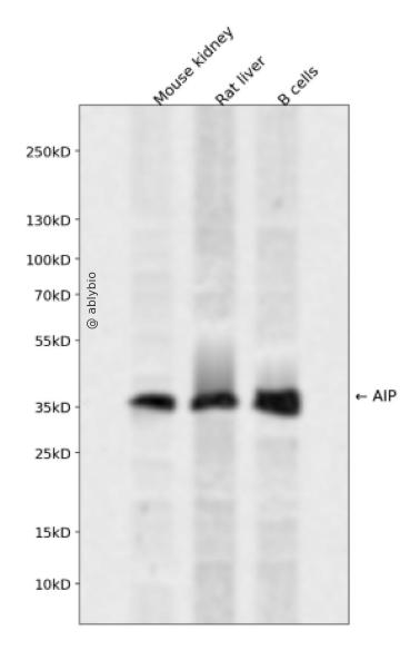 Western blot analysis of AIP expressed in Mouse kidney,Rat liver,B cells using AIP Rabbit pAb at 1:1000. Secondary antibody: HRP Goat Anti-Rabbit IgG (H+L) at 1:5000. Lysates/proteins: 30ug per lane. Blocking buffer: 5% non-fat dry milk in TBST. Detection: ECL Enhanced Kit. Exposure time: 120s.