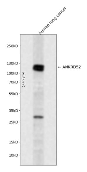 Western blot analysis of ANKRD52 expressed in human lung cancer using ANKRD52 Rabbit pAb at 1:1000. Secondary antibody: HRP Goat Anti-Rabbit IgG (H+L) at 1:5000. Lysates/proteins: 30ug per lane. Blocking buffer: 5% non-fat dry milk in TBST. Detection: ECL Enhanced Kit. Exposure time: 120s.
