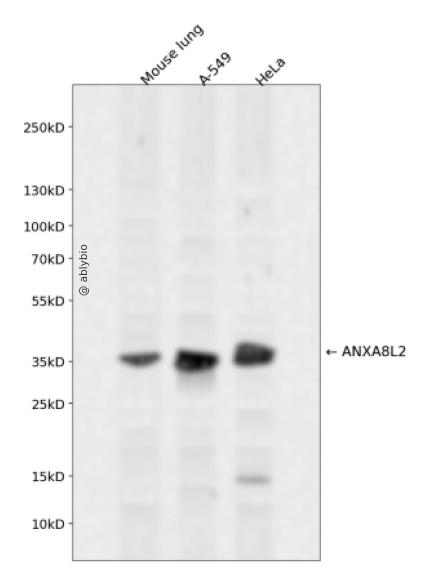 Western blot analysis of ANXA8L2 expressed in Mouse lung,A-549,HeLa using ANXA8L2 Rabbit pAb at 1:1000. Secondary antibody: HRP Goat Anti-Rabbit IgG (H+L) at 1:5000. Lysates/proteins: 30ug per lane. Blocking buffer: 5% non-fat dry milk in TBST. Detection: ECL Enhanced Kit. Exposure time: 120s.