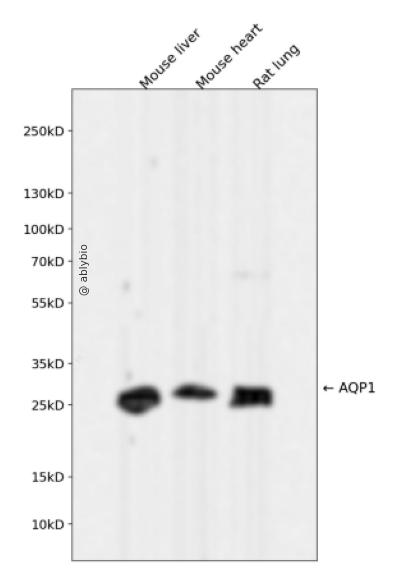 Western blot analysis of AQP1 expressed in Mouse liver,Mouse heart,Rat lung using AQP1 Rabbit mAb at 1:1000. Secondary antibody: HRP Goat Anti-Rabbit IgG (H+L) at 1:5000. Lysates/proteins: 30ug per lane. Blocking buffer: 5% non-fat dry milk in TBST. Detection: ECL Enhanced Kit. Exposure time: 120s.