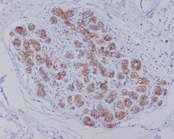 Immunohistochemical analysis of paraffin-embedded human breast, using AQP1 Antibody.