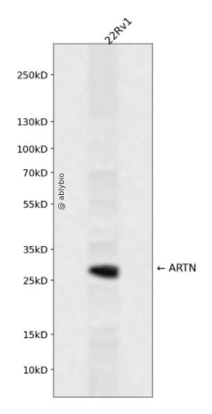 Western blot analysis of ARTN expressed in 22Rv1 using ARTN Rabbit pAb at 1:1000. Secondary antibody: HRP Goat Anti-Rabbit IgG (H+L) at 1:5000. Lysates/proteins: 30ug per lane. Blocking buffer: 5% non-fat dry milk in TBST. Detection: ECL Enhanced Kit. Exposure time: 120s.