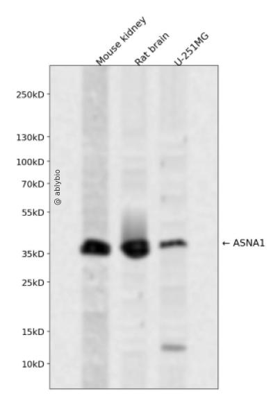 Western blot analysis of ASNA1 expressed in Mouse kidney,Rat brain,U-251MG using ASNA1 Rabbit pAb at 1:1000. Secondary antibody: HRP Goat Anti-Rabbit IgG (H+L) at 1:5000. Lysates/proteins: 30ug per lane. Blocking buffer: 5% non-fat dry milk in TBST. Detection: ECL Enhanced Kit. Exposure time: 120s.