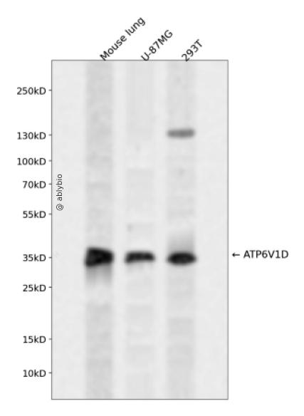 Western blot analysis of ATP6V1D expressed in Mouse lung,U-87MG,293T using ATP6V1D Rabbit pAb at 1:1000. Secondary antibody: HRP Goat Anti-Rabbit IgG (H+L) at 1:5000. Lysates/proteins: 30ug per lane. Blocking buffer: 5% non-fat dry milk in TBST. Detection: ECL Enhanced Kit. Exposure time: 120s.