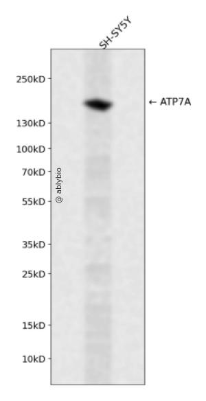 Western blot analysis of ATP7A expressed in SH-SY5Y using ATP7A Rabbit pAb at 1:1000. Secondary antibody: HRP Goat Anti-Rabbit IgG (H+L) at 1:5000. Lysates/proteins: 30ug per lane. Blocking buffer: 5% non-fat dry milk in TBST. Detection: ECL Enhanced Kit. Exposure time: 120s.