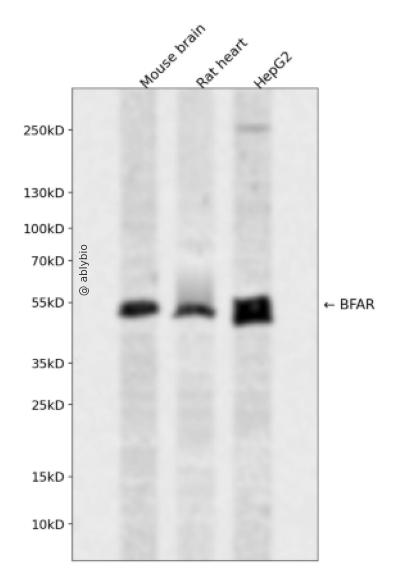 Western blot analysis of BFAR expressed in Mouse brain,Rat heart,HepG2 using BFAR Rabbit pAb at 1:1000. Secondary antibody: HRP Goat Anti-Rabbit IgG (H+L) at 1:5000. Lysates/proteins: 30ug per lane. Blocking buffer: 5% non-fat dry milk in TBST. Detection: ECL Enhanced Kit. Exposure time: 120s.