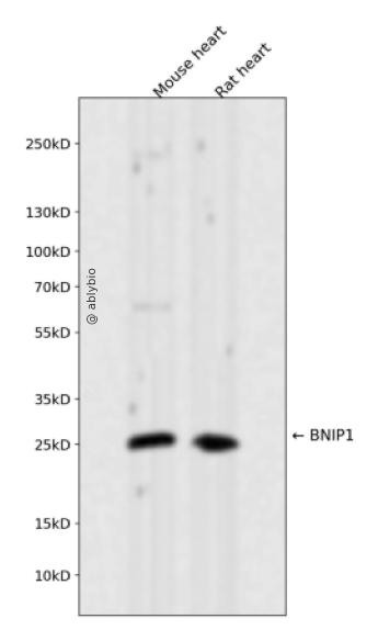 Western blot analysis of BNIP1 expressed in Mouse heart,Rat heart using BNIP1 Rabbit mAb at 1:1000. Secondary antibody: HRP Goat Anti-Rabbit IgG (H+L) at 1:5000. Lysates/proteins: 30ug per lane. Blocking buffer: 5% non-fat dry milk in TBST. Detection: ECL Enhanced Kit. Exposure time: 120s.