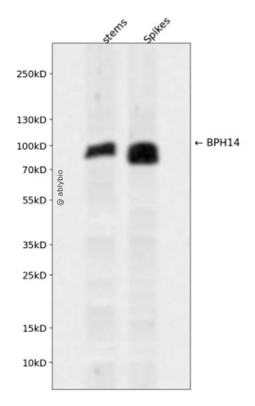Western blot analysis of BPH14 expressed in stems,Spikes using BPH14 Rabbit pAb at 1:1000. Secondary antibody: HRP Goat Anti-Rabbit IgG (H+L) at 1:5000. Lysates/proteins: 30ug per lane. Blocking buffer: 5% non-fat dry milk in TBST. Detection: ECL Enhanced Kit. Exposure time: 120s.