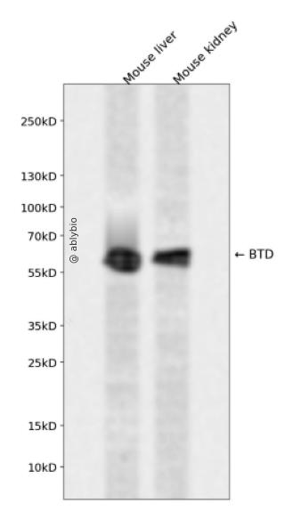 Western blot analysis of BTD expressed in Mouse liver,Mouse kidney using BTD Rabbit pAb at 1:1000. Secondary antibody: HRP Goat Anti-Rabbit IgG (H+L) at 1:5000. Lysates/proteins: 30ug per lane. Blocking buffer: 5% non-fat dry milk in TBST. Detection: ECL Enhanced Kit. Exposure time: 120s.