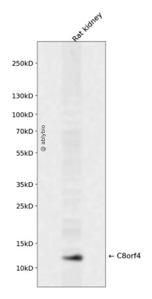 Western blot analysis of C8orf4 expressed in Rat kidney using C8orf4 Rabbit pAb at 1:1000. Secondary antibody: HRP Goat Anti-Rabbit IgG (H+L) at 1:5000. Lysates/proteins: 30ug per lane. Blocking buffer: 5% non-fat dry milk in TBST. Detection: ECL Enhanced Kit. Exposure time: 120s.