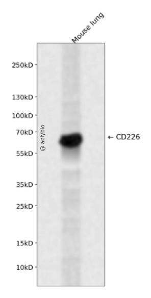 Western blot analysis of CD226 expressed in Mouse lung using CD226 Rabbit pAb at 1:1000. Secondary antibody: HRP Goat Anti-Rabbit IgG (H+L) at 1:5000. Lysates/proteins: 30ug per lane. Blocking buffer: 5% non-fat dry milk in TBST. Detection: ECL Enhanced Kit. Exposure time: 120s.