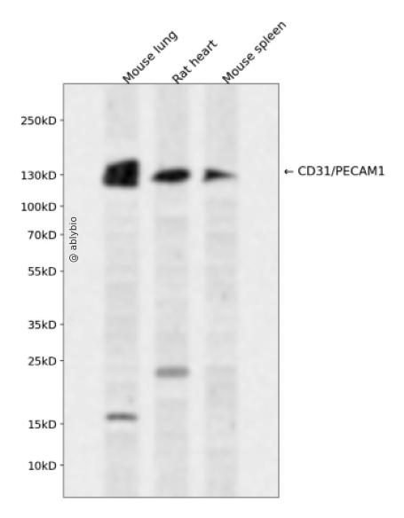 Western blot analysis of CD31/PECAM1 expressed in Mouse lung,Rat heart,Mouse spleen using CD31/PECAM1 Rabbit pAb at 1:1000. Secondary antibody: HRP Goat Anti-Rabbit IgG (H+L) at 1:5000. Lysates/proteins: 30ug per lane. Blocking buffer: 5% non-fat dry milk in TBST. Detection: ECL Enhanced Kit. Exposure time: 120s.
