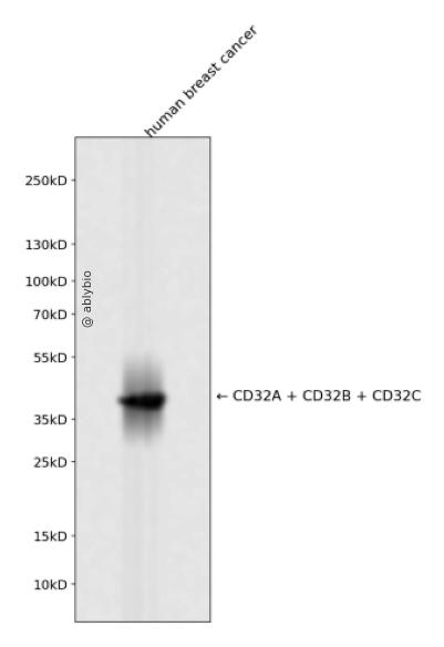 Western blot analysis of CD32A + CD32B + CD32C expressed in human breast cancer using CD32A + CD32B + CD32C Rabbit mAb at 1:1000. Secondary antibody: HRP Goat Anti-Rabbit IgG (H+L) at 1:5000. Lysates/proteins: 30ug per lane. Blocking buffer: 5% non-fat dry milk in TBST. Detection: ECL Enhanced Kit. Exposure time: 120s.