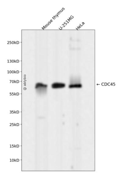 Western blot analysis of CDC45 expressed in Mouse thymus,U-251MG,HeLa using CDC45 Rabbit mAb at 1:1000. Secondary antibody: HRP Goat Anti-Rabbit IgG (H+L) at 1:5000. Lysates/proteins: 30ug per lane. Blocking buffer: 5% non-fat dry milk in TBST. Detection: ECL Enhanced Kit. Exposure time: 120s.