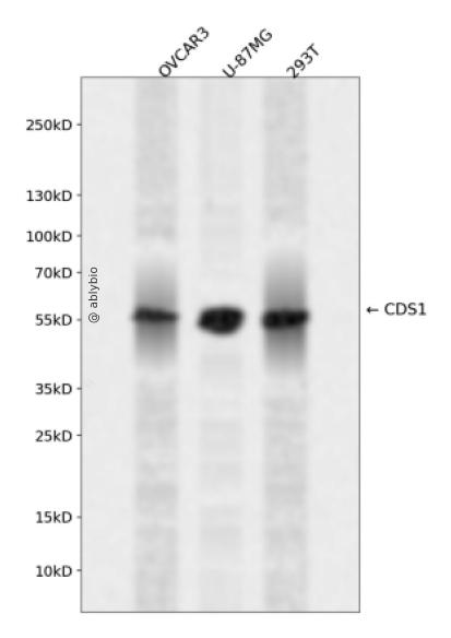 Western blot analysis of CDS1 expressed in OVCAR3,U-87MG,293T using CDS1 Rabbit pAb at 1:1000. Secondary antibody: HRP Goat Anti-Rabbit IgG (H+L) at 1:5000. Lysates/proteins: 30ug per lane. Blocking buffer: 5% non-fat dry milk in TBST. Detection: ECL Enhanced Kit. Exposure time: 120s.
