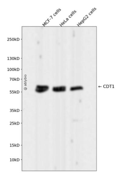 Western blot analysis of CDT1 expressed in MCF-7 cells,HeLa cells,HepG2 cells using CDT1 Rabbit mAb at 1:1000. Secondary antibody: HRP Goat Anti-Rabbit IgG (H+L) at 1:5000. Lysates/proteins: 30ug per lane. Blocking buffer: 5% non-fat dry milk in TBST. Detection: ECL Enhanced Kit. Exposure time: 120s.