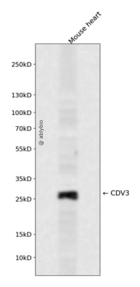Western blot analysis of CDV3 expressed in Mouse heart using CDV3 Rabbit pAb at 1:1000. Secondary antibody: HRP Goat Anti-Rabbit IgG (H+L) at 1:5000. Lysates/proteins: 30ug per lane. Blocking buffer: 5% non-fat dry milk in TBST. Detection: ECL Enhanced Kit. Exposure time: 120s.