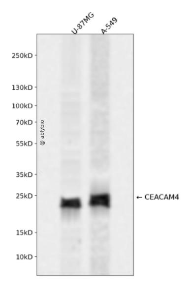 Western blot analysis of CEACAM4 expressed in U-87MG,A-549 using CEACAM4 Rabbit pAb at 1:1000. Secondary antibody: HRP Goat Anti-Rabbit IgG (H+L) at 1:5000. Lysates/proteins: 30ug per lane. Blocking buffer: 5% non-fat dry milk in TBST. Detection: ECL Enhanced Kit. Exposure time: 120s.