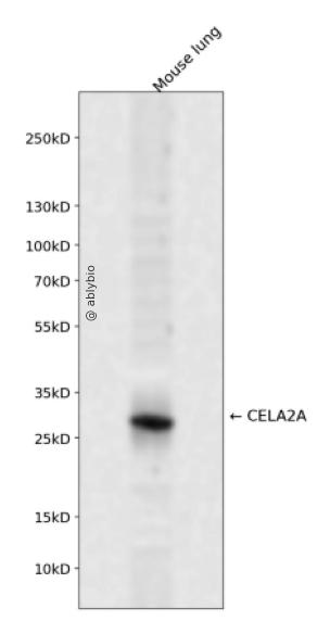 Western blot analysis of CELA2A expressed in Mouse lung using CELA2A Rabbit pAb at 1:1000. Secondary antibody: HRP Goat Anti-Rabbit IgG (H+L) at 1:5000. Lysates/proteins: 30ug per lane. Blocking buffer: 5% non-fat dry milk in TBST. Detection: ECL Enhanced Kit. Exposure time: 120s.