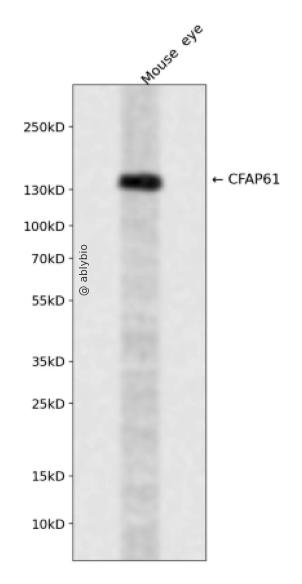 Western blot analysis of CFAP61 expressed in Mouse eye using CFAP61 Rabbit pAb at 1:1000. Secondary antibody: HRP Goat Anti-Rabbit IgG (H+L) at 1:5000. Lysates/proteins: 30ug per lane. Blocking buffer: 5% non-fat dry milk in TBST. Detection: ECL Enhanced Kit. Exposure time: 120s.