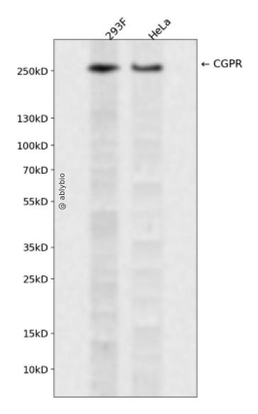 Western blot analysis of CGPR expressed in 293F,HeLa using CGPR Rabbit pAb at 1:1000. Secondary antibody: HRP Goat Anti-Rabbit IgG (H+L) at 1:5000. Lysates/proteins: 30ug per lane. Blocking buffer: 5% non-fat dry milk in TBST. Detection: ECL Enhanced Kit. Exposure time: 120s.