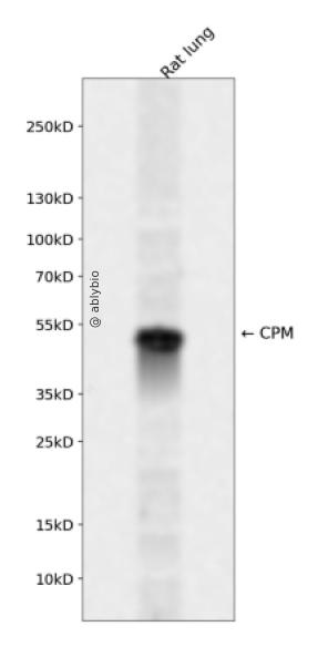 Western blot analysis of CPM expressed in Rat lung using CPM Rabbit pAb at 1:1000. Secondary antibody: HRP Goat Anti-Rabbit IgG (H+L) at 1:5000. Lysates/proteins: 30ug per lane. Blocking buffer: 5% non-fat dry milk in TBST. Detection: ECL Enhanced Kit. Exposure time: 120s.