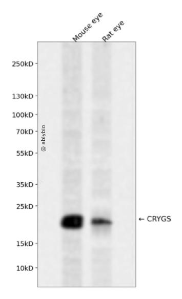 Western blot analysis of CRYGS expressed in Mouse eye,Rat eye using CRYGS Rabbit pAb at 1:1000. Secondary antibody: HRP Goat Anti-Rabbit IgG (H+L) at 1:5000. Lysates/proteins: 30ug per lane. Blocking buffer: 5% non-fat dry milk in TBST. Detection: ECL Enhanced Kit. Exposure time: 120s.