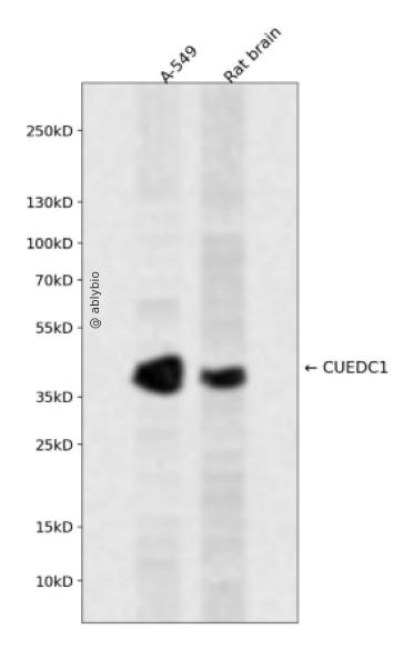 Western blot analysis of CUEDC1 expressed in A-549,Rat brain using CUEDC1 Rabbit pAb at 1:1000. Secondary antibody: HRP Goat Anti-Rabbit IgG (H+L) at 1:5000. Lysates/proteins: 30ug per lane. Blocking buffer: 5% non-fat dry milk in TBST. Detection: ECL Enhanced Kit. Exposure time: 120s.
