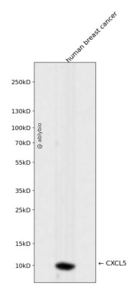 Western blot analysis of CXCL5 expressed in human breast cancer using CXCL5 Rabbit mAb at 1:1000. Secondary antibody: HRP Goat Anti-Rabbit IgG (H+L) at 1:5000. Lysates/proteins: 30ug per lane. Blocking buffer: 5% non-fat dry milk in TBST. Detection: ECL Enhanced Kit. Exposure time: 120s.