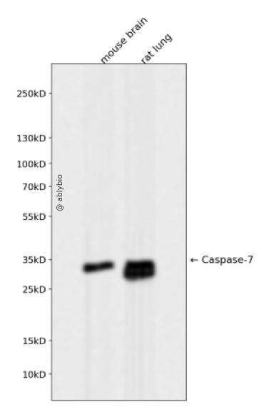 Western blot analysis of Caspase-7 expressed in mouse brain,rat lung using Caspase-7 Rabbit mAb at 1:1000. Secondary antibody: HRP Goat Anti-Rabbit IgG (H+L) at 1:5000. Lysates/proteins: 30ug per lane. Blocking buffer: 5% non-fat dry milk in TBST. Detection: ECL Enhanced Kit. Exposure time: 120s.