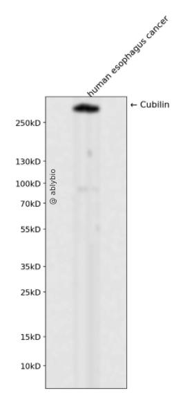 Western blot analysis of Cubilin expressed in human esophagus cancer using Cubilin Rabbit mAb at 1:1000. Secondary antibody: HRP Goat Anti-Rabbit IgG (H+L) at 1:5000. Lysates/proteins: 30ug per lane. Blocking buffer: 5% non-fat dry milk in TBST. Detection: ECL Enhanced Kit. Exposure time: 120s.