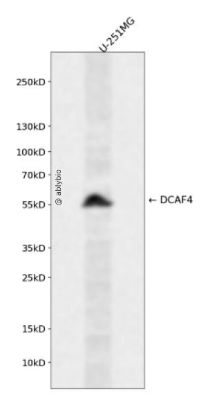 Western blot analysis of DCAF4 expressed in U-251MG using DCAF4 Rabbit pAb at 1:1000. Secondary antibody: HRP Goat Anti-Rabbit IgG (H+L) at 1:5000. Lysates/proteins: 30ug per lane. Blocking buffer: 5% non-fat dry milk in TBST. Detection: ECL Enhanced Kit. Exposure time: 120s.