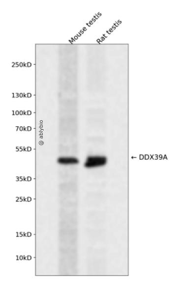 Western blot analysis of DDX39A expressed in Mouse testis,Rat testis using DDX39A Rabbit pAb at 1:1000. Secondary antibody: HRP Goat Anti-Rabbit IgG (H+L) at 1:5000. Lysates/proteins: 30ug per lane. Blocking buffer: 5% non-fat dry milk in TBST. Detection: ECL Enhanced Kit. Exposure time: 120s.