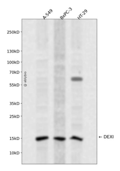 Western blot analysis of DEXI expressed in A-549,BxPC-3,HT-29 using DEXI Rabbit pAb at 1:1000. Secondary antibody: HRP Goat Anti-Rabbit IgG (H+L) at 1:5000. Lysates/proteins: 30ug per lane. Blocking buffer: 5% non-fat dry milk in TBST. Detection: ECL Enhanced Kit. Exposure time: 120s.
