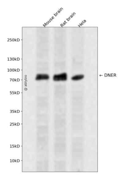 研究背景 DNER (Delta/Notch-like EGF-related receptor), also known as BET (brain-specific EGF-like transmembrane protein), is a type I transmembrane glycoprotein of the Notch/Delta family . In the mouse, DNER has been detected as 90, 120 and 150 kDa forms which are probably variably glycosylated .Activator of the NOTCH1 pathway. May mediate neuron-glia interaction during astrocytogenesis.DNER associates with protein tyrosine phosphatase zeta (PTP zeta ), which is the receptor of pleiotrophin (PTN). PTP zeta -PTN-DNER signaling has been implicated in the regulation of neuritogenesis. Expression of DNER in glioblastoma stem-like cells inhibits formation of neurospheres in vitro, while in vivo it induces differentiation and inhibits growth of xenografts, thus acting as a tumor suppressor.
