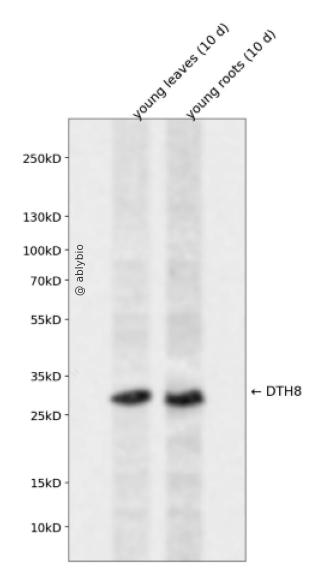 Western blot analysis of DTH8 expressed in young leaves (10 d),young roots (10 d) using DTH8 Rabbit pAb at 1:1000. Secondary antibody: HRP Goat Anti-Rabbit IgG (H+L) at 1:5000. Lysates/proteins: 30ug per lane. Blocking buffer: 5% non-fat dry milk in TBST. Detection: ECL Enhanced Kit. Exposure time: 120s.