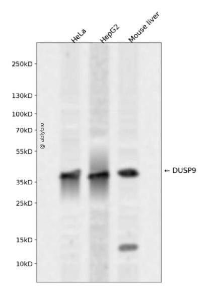 Western blot analysis of DUSP9 expressed in HeLa,HepG2,Mouse liver using DUSP9 Rabbit pAb at 1:1000. Secondary antibody: HRP Goat Anti-Rabbit IgG (H+L) at 1:5000. Lysates/proteins: 30ug per lane. Blocking buffer: 5% non-fat dry milk in TBST. Detection: ECL Enhanced Kit. Exposure time: 120s.