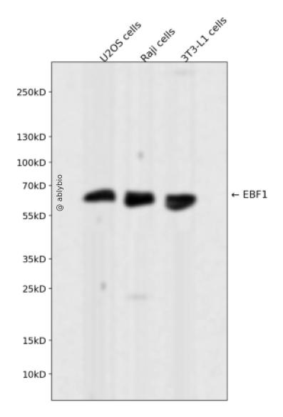 Western blot analysis of EBF1 expressed in U2OS cells,Raji cells,3T3-L1 cells using EBF1 Rabbit mAb at 1:1000. Secondary antibody: HRP Goat Anti-Rabbit IgG (H+L) at 1:5000. Lysates/proteins: 30ug per lane. Blocking buffer: 5% non-fat dry milk in TBST. Detection: ECL Enhanced Kit. Exposure time: 120s.