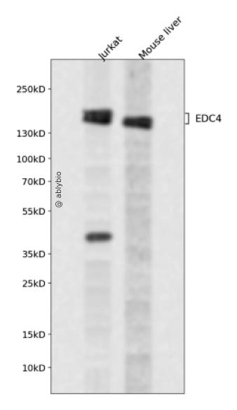Western blot analysis of EDC4 expressed in Jurkat,Mouse liver using EDC4 Rabbit pAb at 1:1000. Secondary antibody: HRP Goat Anti-Rabbit IgG (H+L) at 1:5000. Lysates/proteins: 30ug per lane. Blocking buffer: 5% non-fat dry milk in TBST. Detection: ECL Enhanced Kit. Exposure time: 120s.