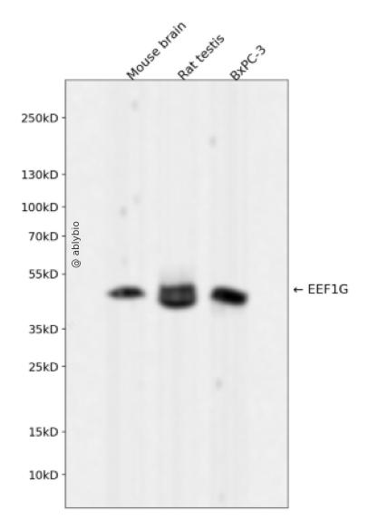Western blot analysis of EEF1G expressed in Mouse brain,Rat testis,BxPC-3 using EEF1G Rabbit mAb at 1:1000. Secondary antibody: HRP Goat Anti-Rabbit IgG (H+L) at 1:5000. Lysates/proteins: 30ug per lane. Blocking buffer: 5% non-fat dry milk in TBST. Detection: ECL Enhanced Kit. Exposure time: 120s.