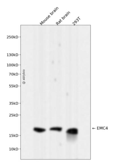 Western blot analysis of EMC4 expressed in Mouse brain,Rat brain,293T using EMC4 Rabbit mAb at 1:1000. Secondary antibody: HRP Goat Anti-Rabbit IgG (H+L) at 1:5000. Lysates/proteins: 30ug per lane. Blocking buffer: 5% non-fat dry milk in TBST. Detection: ECL Enhanced Kit. Exposure time: 120s.