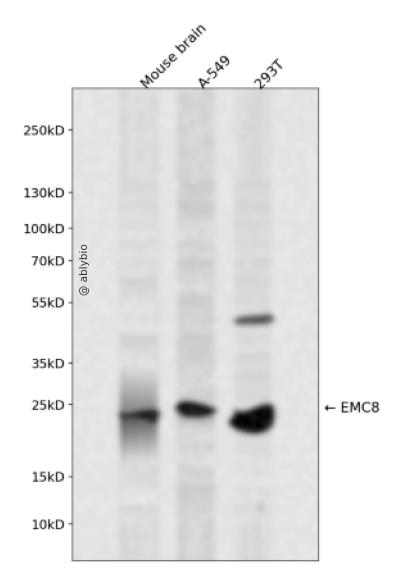 Western blot analysis of EMC8 expressed in Mouse brain,A-549,293T using EMC8 Rabbit pAb at 1:1000. Secondary antibody: HRP Goat Anti-Rabbit IgG (H+L) at 1:5000. Lysates/proteins: 30ug per lane. Blocking buffer: 5% non-fat dry milk in TBST. Detection: ECL Enhanced Kit. Exposure time: 120s.
