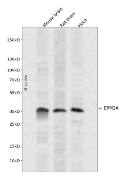 Western blot analysis of EPM2A expressed in Mouse brain,Rat brain,HeLa using EPM2A Rabbit pAb at 1:1000. Secondary antibody: HRP Goat Anti-Rabbit IgG (H+L) at 1:5000. Lysates/proteins: 30ug per lane. Blocking buffer: 5% non-fat dry milk in TBST. Detection: ECL Enhanced Kit. Exposure time: 120s.