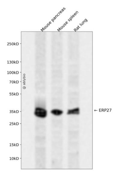 Western blot analysis of ERP27 expressed in Mouse pancreas,Mouse spleen,Rat lung using ERP27 Rabbit pAb at 1:1000. Secondary antibody: HRP Goat Anti-Rabbit IgG (H+L) at 1:5000. Lysates/proteins: 30ug per lane. Blocking buffer: 5% non-fat dry milk in TBST. Detection: ECL Enhanced Kit. Exposure time: 120s.