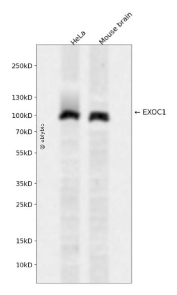 Western blot analysis of EXOC1 expressed in HeLa,Mouse brain using EXOC1 Rabbit pAb at 1:1000. Secondary antibody: HRP Goat Anti-Rabbit IgG (H+L) at 1:5000. Lysates/proteins: 30ug per lane. Blocking buffer: 5% non-fat dry milk in TBST. Detection: ECL Enhanced Kit. Exposure time: 120s.