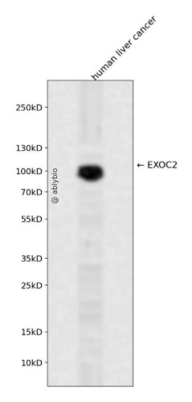 Western blot analysis of EXOC2 expressed in human liver cancer using EXOC2 Rabbit pAb at 1:1000. Secondary antibody: HRP Goat Anti-Rabbit IgG (H+L) at 1:5000. Lysates/proteins: 30ug per lane. Blocking buffer: 5% non-fat dry milk in TBST. Detection: ECL Enhanced Kit. Exposure time: 120s.