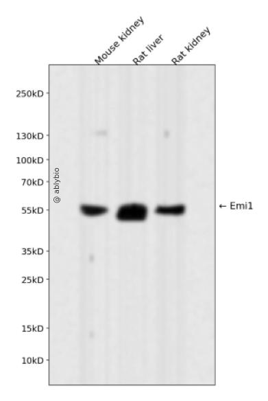 Western blot analysis of Emi1 expressed in Mouse kidney,Rat liver,Rat kidney using Emi1 Rabbit mAb at 1:1000. Secondary antibody: HRP Goat Anti-Rabbit IgG (H+L) at 1:5000. Lysates/proteins: 30ug per lane. Blocking buffer: 5% non-fat dry milk in TBST. Detection: ECL Enhanced Kit. Exposure time: 120s.