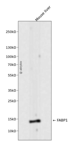 Western blot analysis of FABP1 expressed in Mouse liver using FABP1 Rabbit mAb at 1:1000. Secondary antibody: HRP Goat Anti-Rabbit IgG (H+L) at 1:5000. Lysates/proteins: 30ug per lane. Blocking buffer: 5% non-fat dry milk in TBST. Detection: ECL Enhanced Kit. Exposure time: 120s.